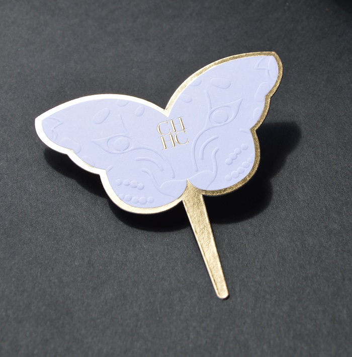 Pour ce faire nous avons réalisé une forme de découpe « papillon » afin de correspondre au parfum CH Beauties. Pour le flacon CH Beasts, nous avons utilisé la technique du gaufrage pour laisser apparaître le côté félin.