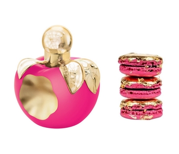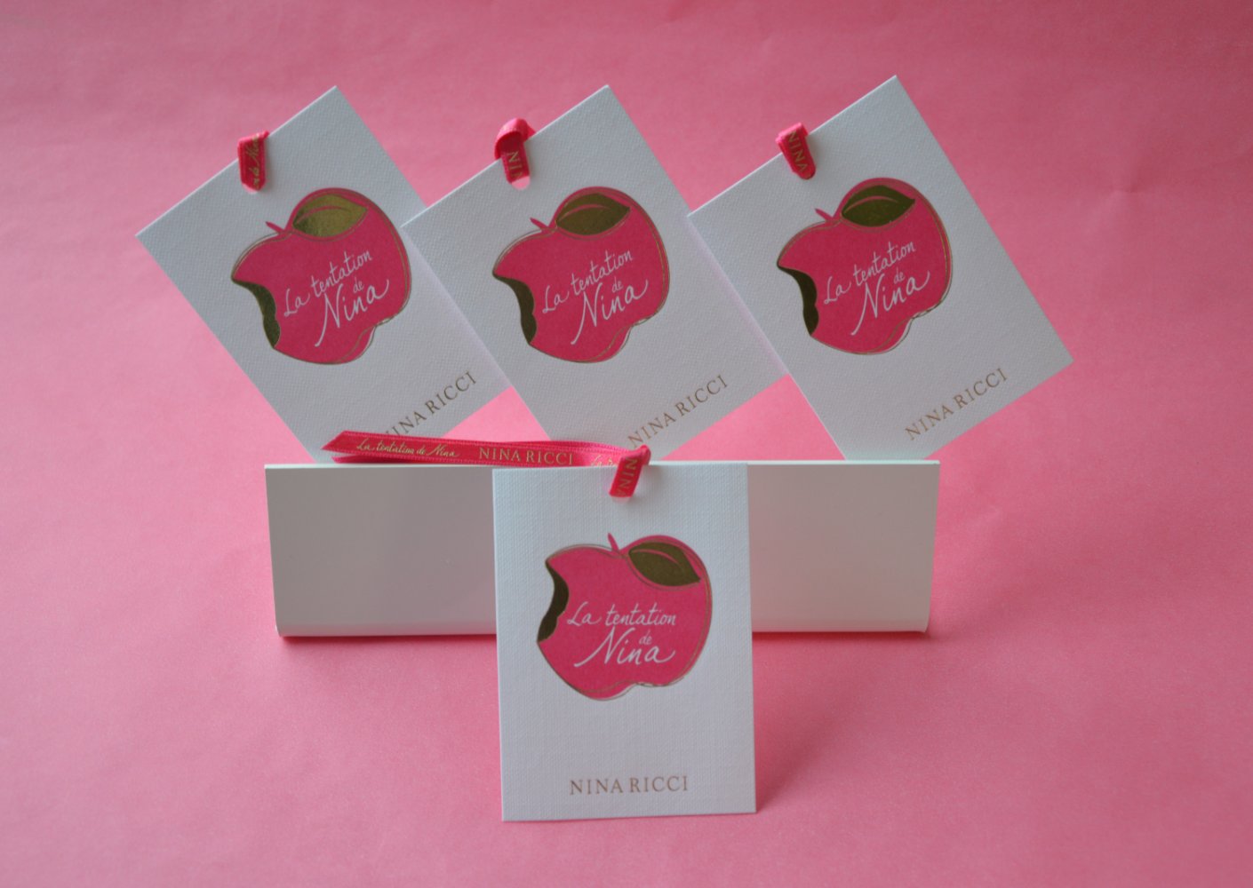 Pour cette touche, l’estampage (technique du poinçon et du matriçage, en venant apposer la forme de la matrice sur une feuille de carte à parfum) est utilisé pour obtenir des motifs d’impressions en relief. De plus le PRINT de la pomme Nina en rose ajouté avec la dorure vient souligner la ligne du modèle.