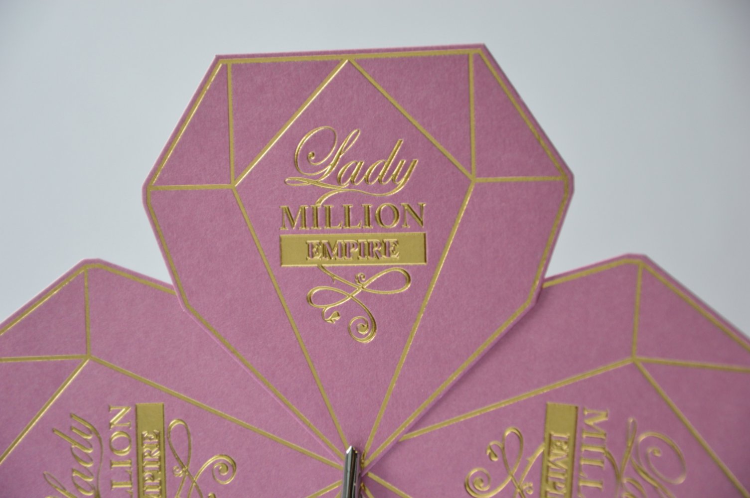 Pour ce faire, nous avons réalisé une forme de découpe à l'image d'un diamant. Le papier teinté masse rose a été fabriqué avec précision, de façon à Benchmarker la couleur du flacon. Ses lignes sont soulignées grâce à la dorure galbée.