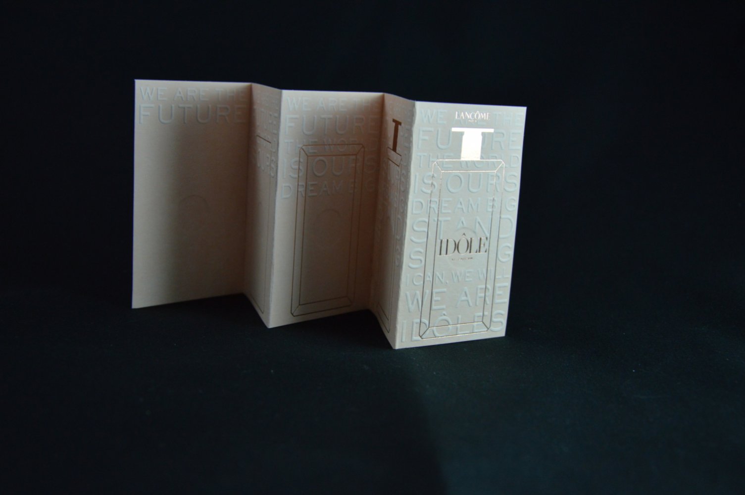 - Marquage à chaud cuivré : utilisé pour la mise en valeur de la marque et du flacon– la couleur cuivrée a été choisie à l’identique du bouchon du flacon LANCÔME ;